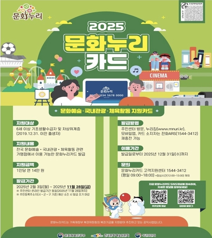 이 두 가지 요건 중 하나에 해당하면 문화누리카드 발급 대상이 되며, 연간 지원금 14만 원을 받을 수 있습니다.