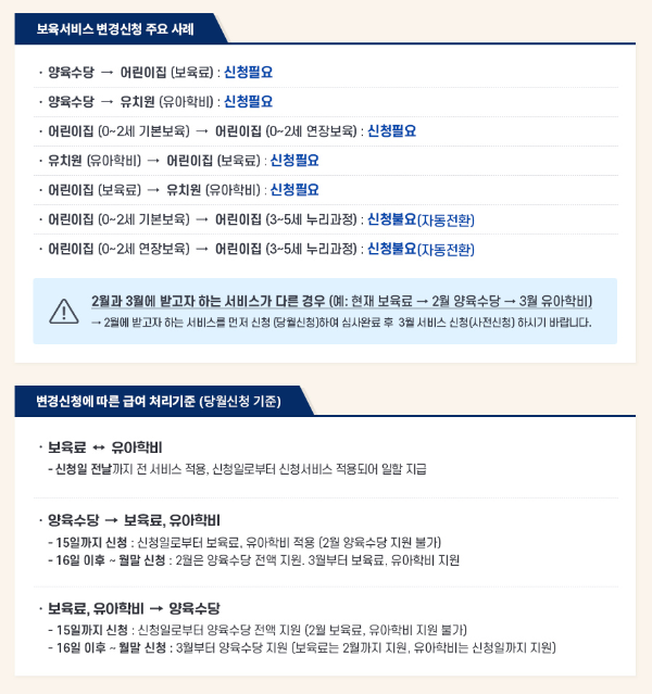 특히, 자녀가 어린이집에 입소하거나 유치원에 입학하는 경우, 해당 서비스에 맞는 신청을 꼭 해주셔야 합니다.